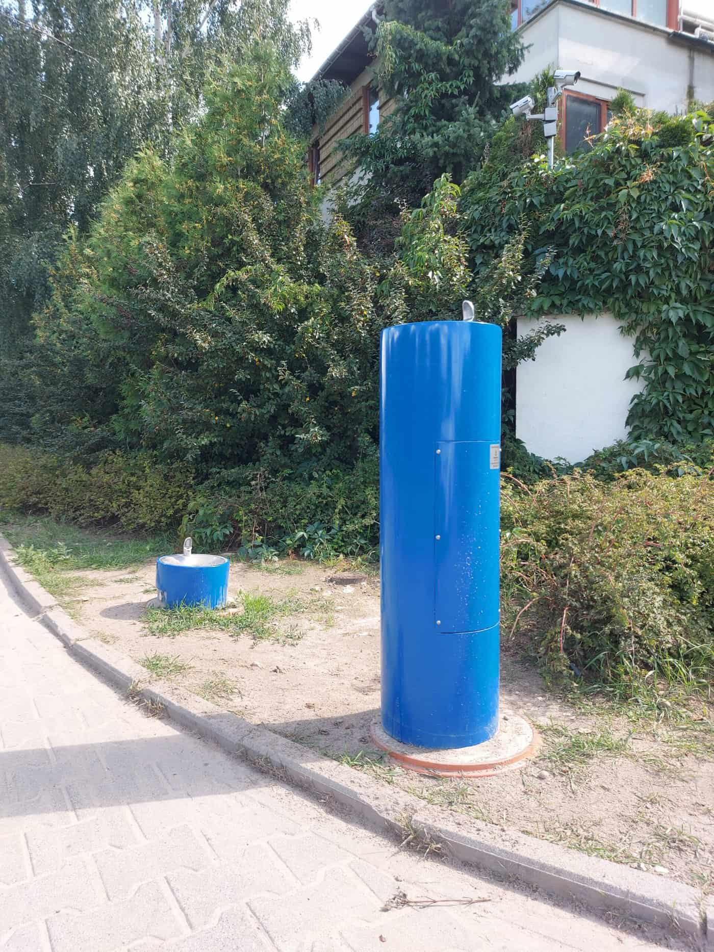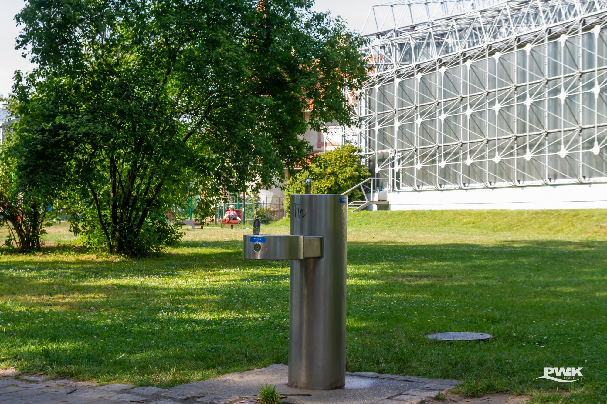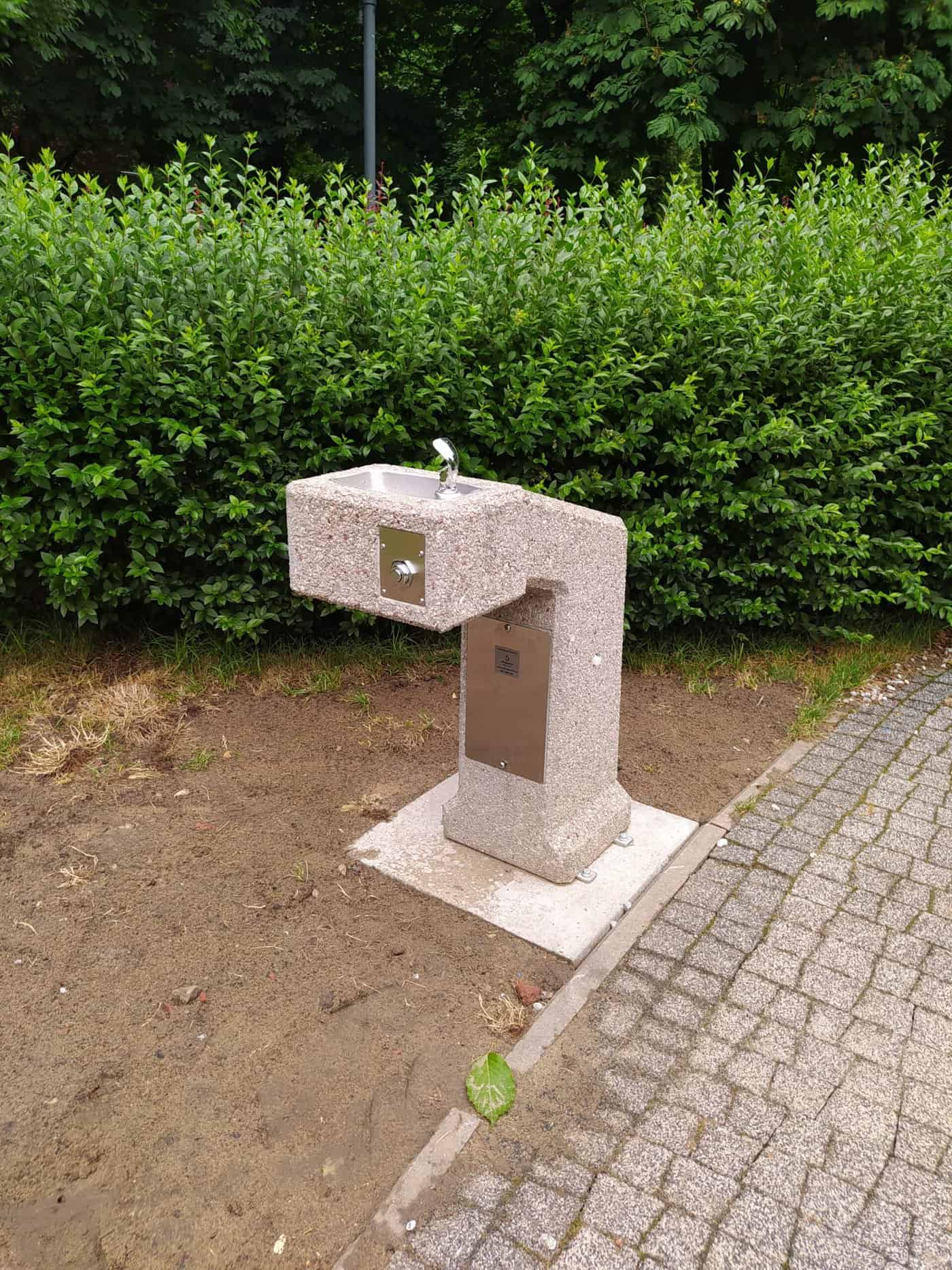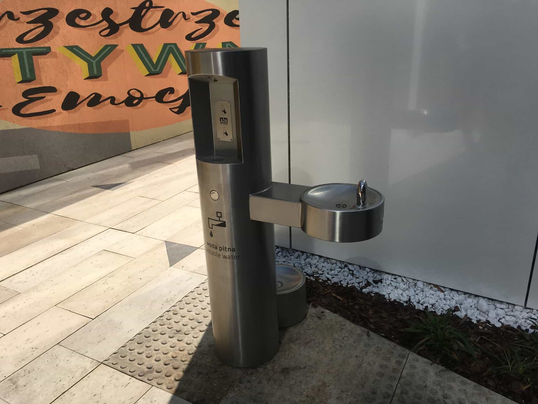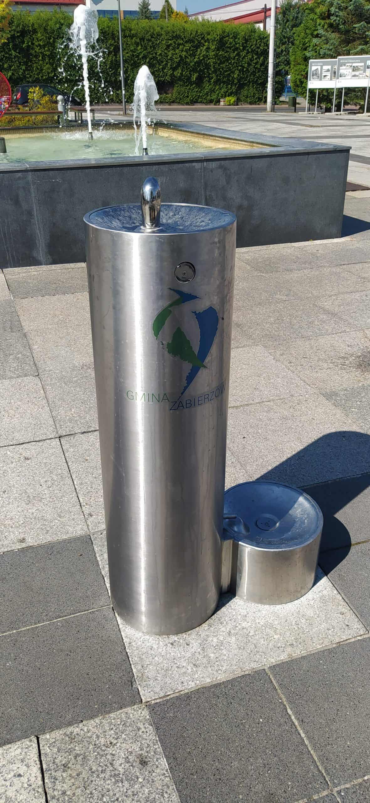 Zdrój wody pitnej postumentowy, ze stali nierdzewnej, odporny na korozję oraz warunki atmosferyczne, wandaloodporny.