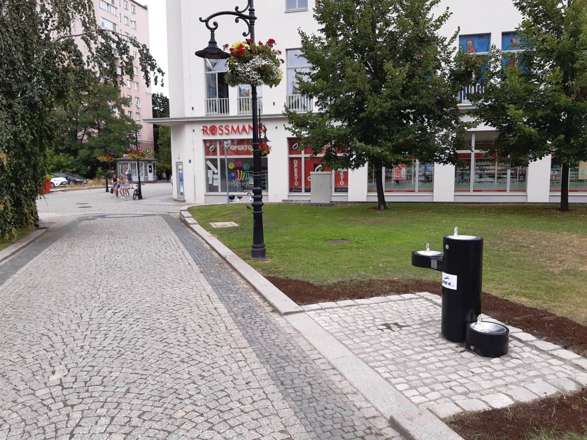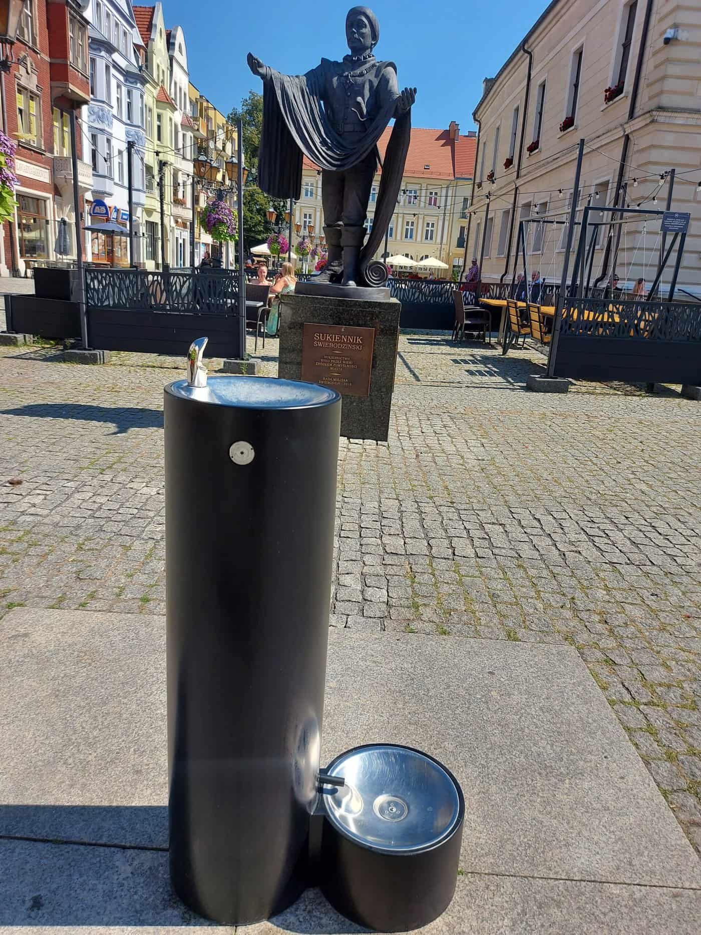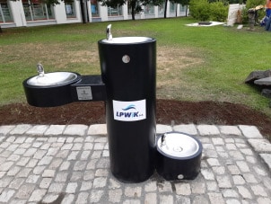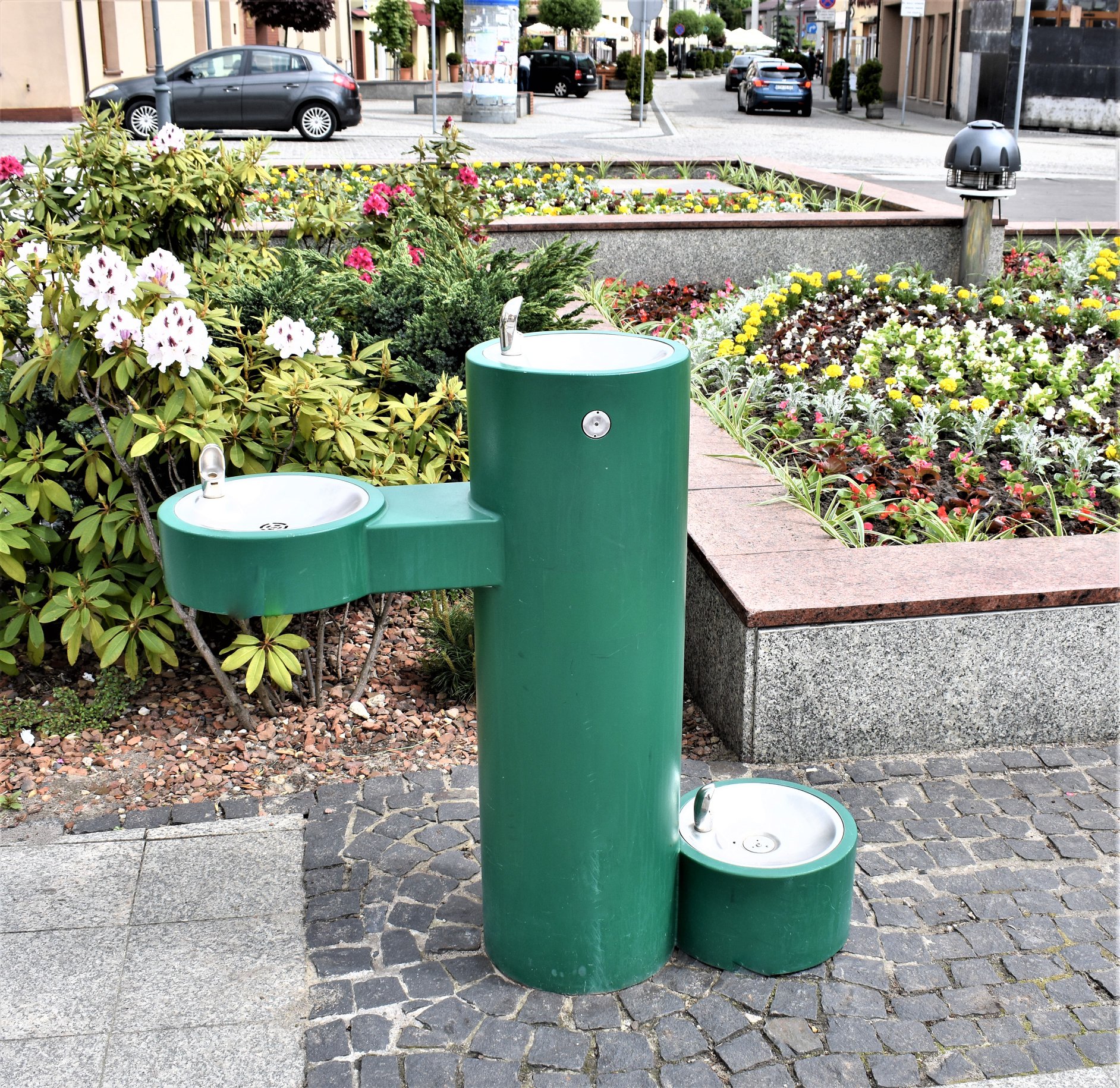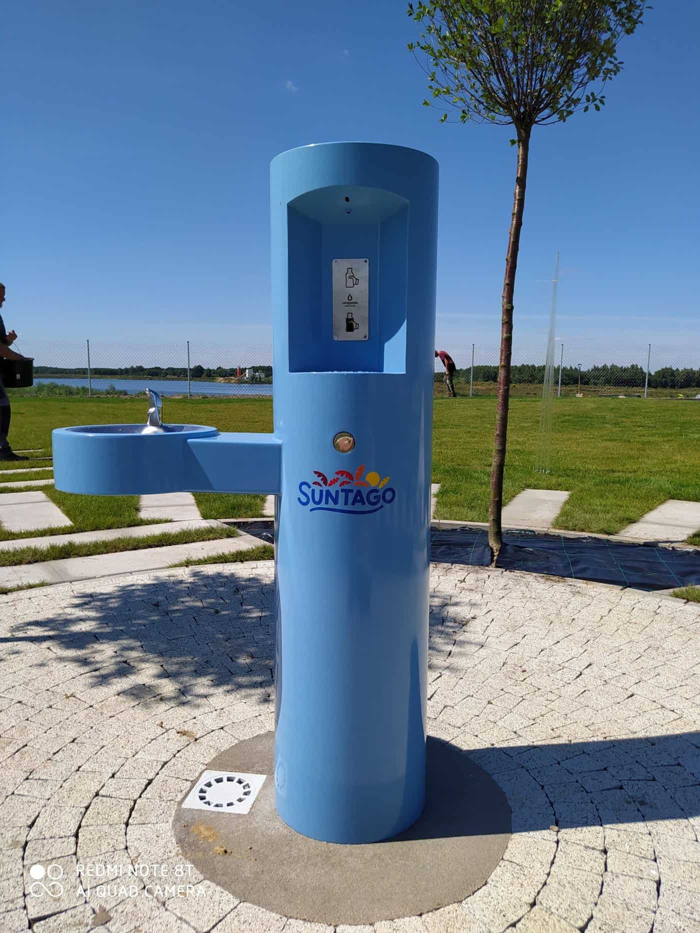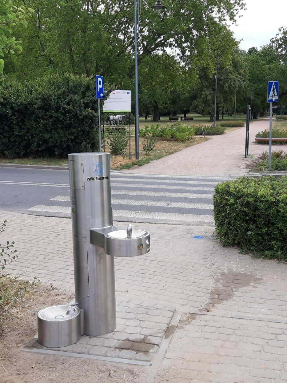 Zdrój wody pitnej postumentowy, ze stali nierdzewnej, odporny na korozję oraz warunki atmosferyczne, wandaloodporny.